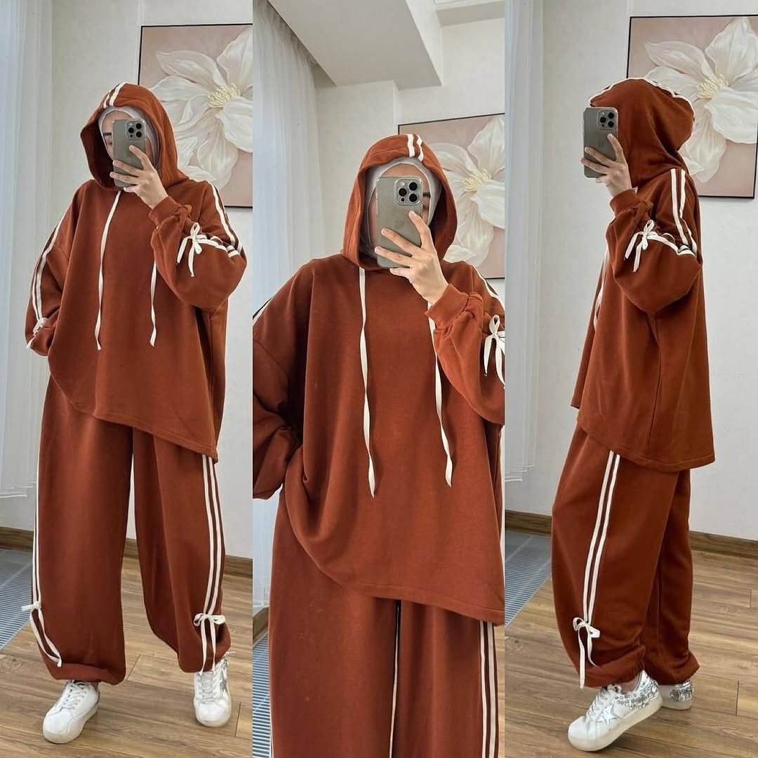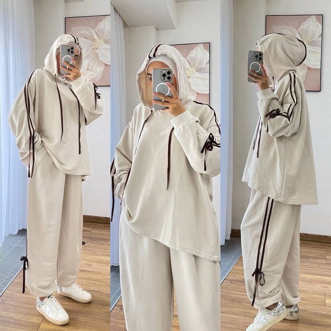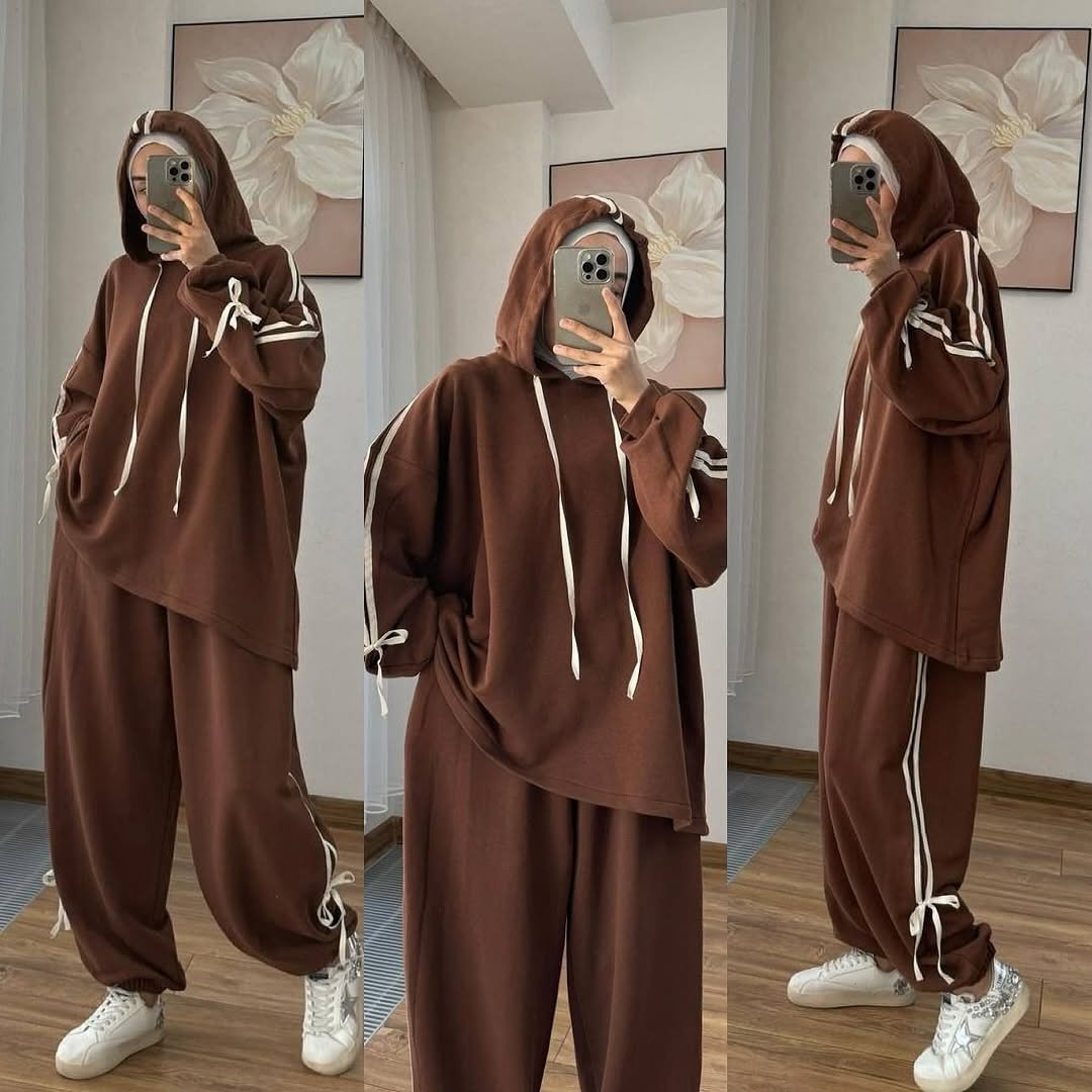 Redefine active modestwear with the EaseFit Modest Tracksuit β designed for women who value both comfort and confidence. Crafted from soft, breathable premium fabric, this two-piece set features a relaxed hooded top with drawstrings and wide-leg trousers detailed with side ties for a modern, sporty edge.