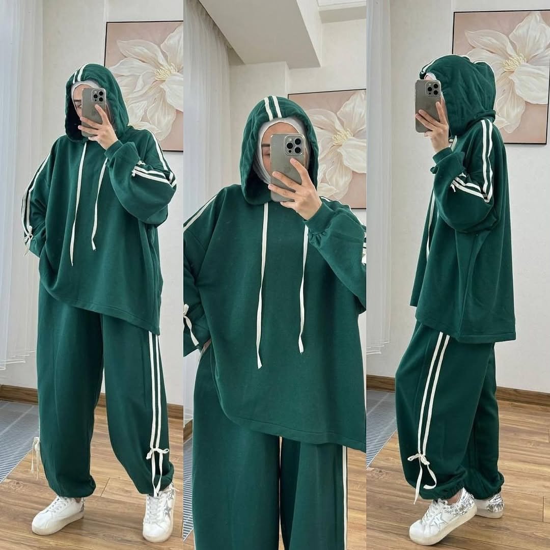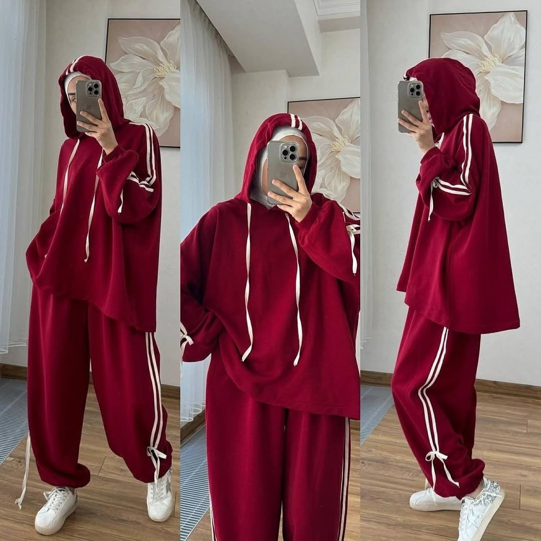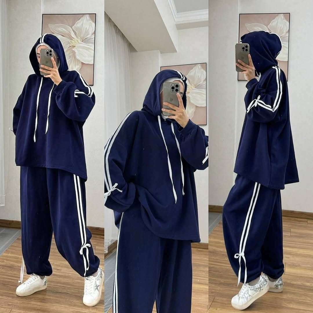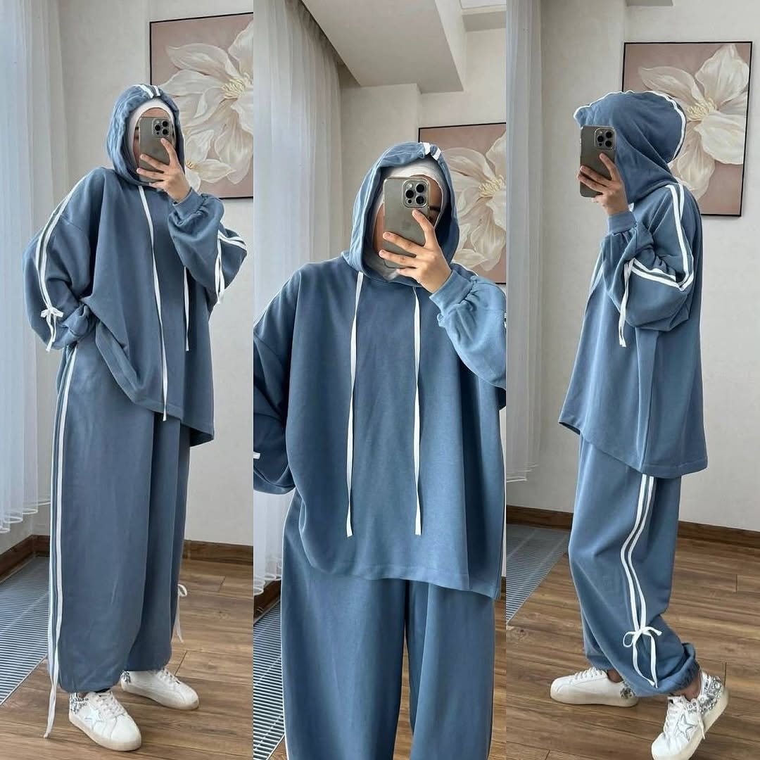 Redefine active modestwear with the EaseFit Modest Tracksuit β designed for women who value both comfort and confidence. Crafted from soft, breathable premium fabric, this two-piece set features a relaxed hooded top with drawstrings and wide-leg trousers detailed with side ties for a modern, sporty edge.