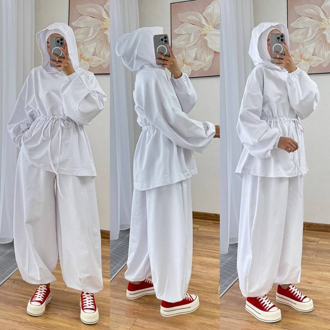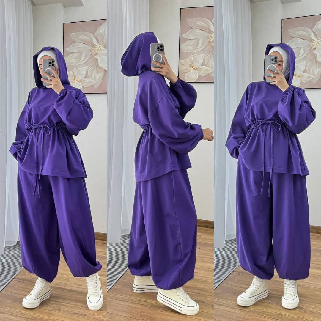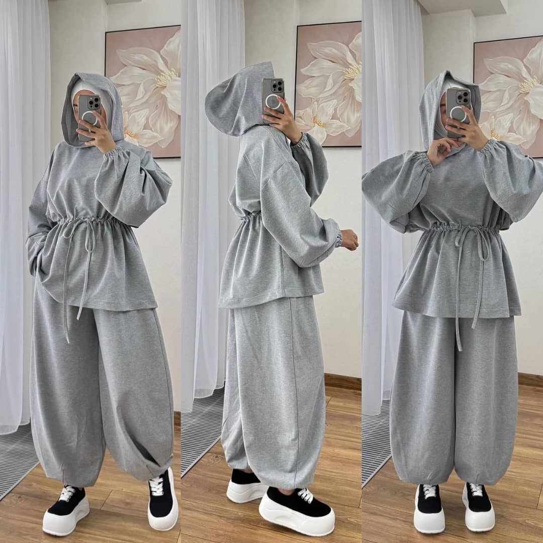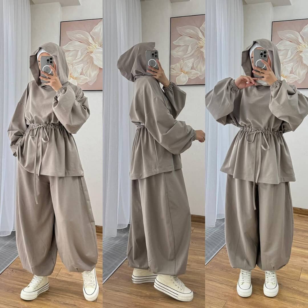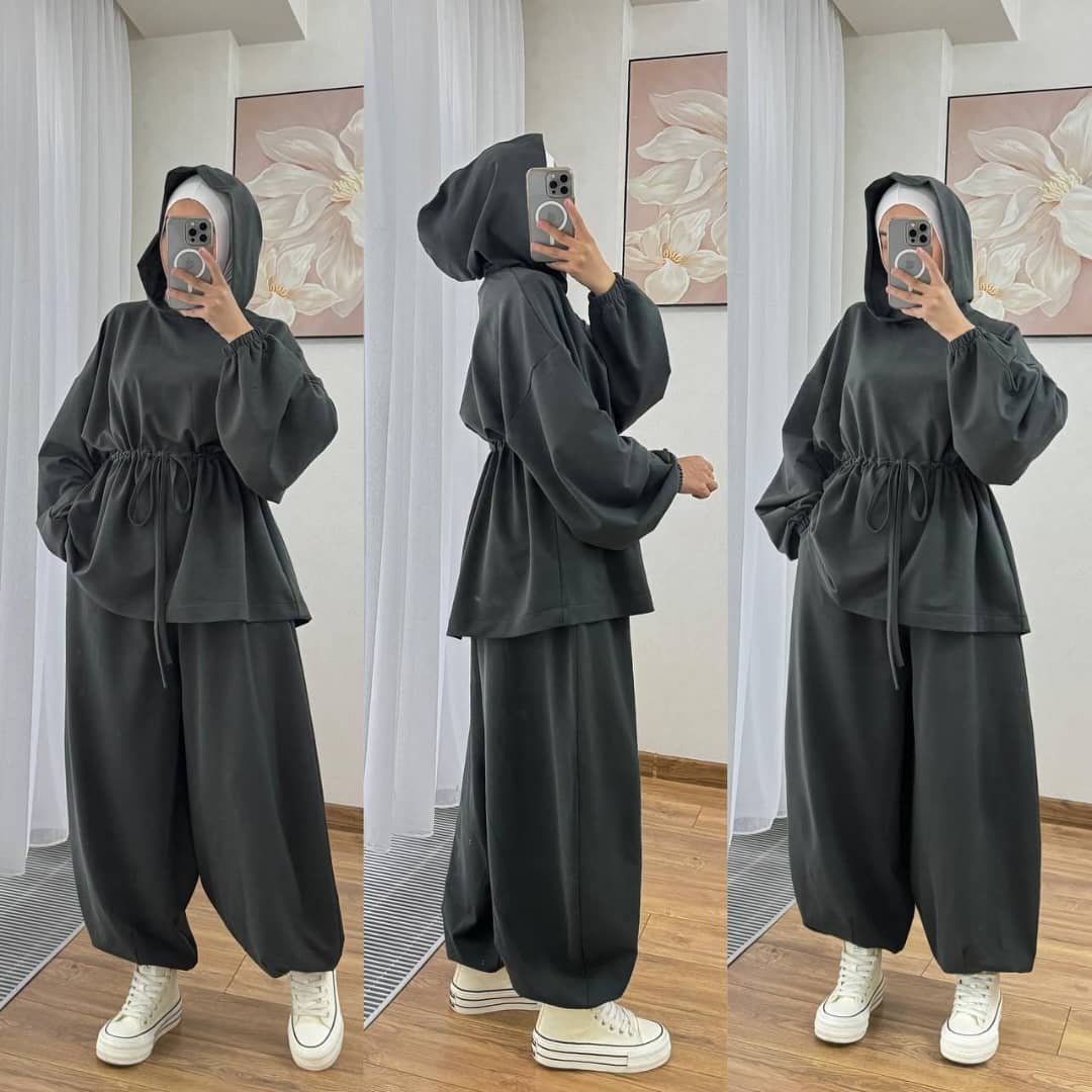 Elevate your modest fashion game with the Noor Flow Modest Set . sporty two piece set. This chic two-piece features a relaxed hooded top and matching wide-leg trousers, blending sporty comfort with elegant style — perfect for casual days, travel, or relaxed outings.