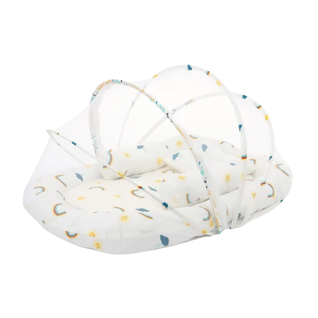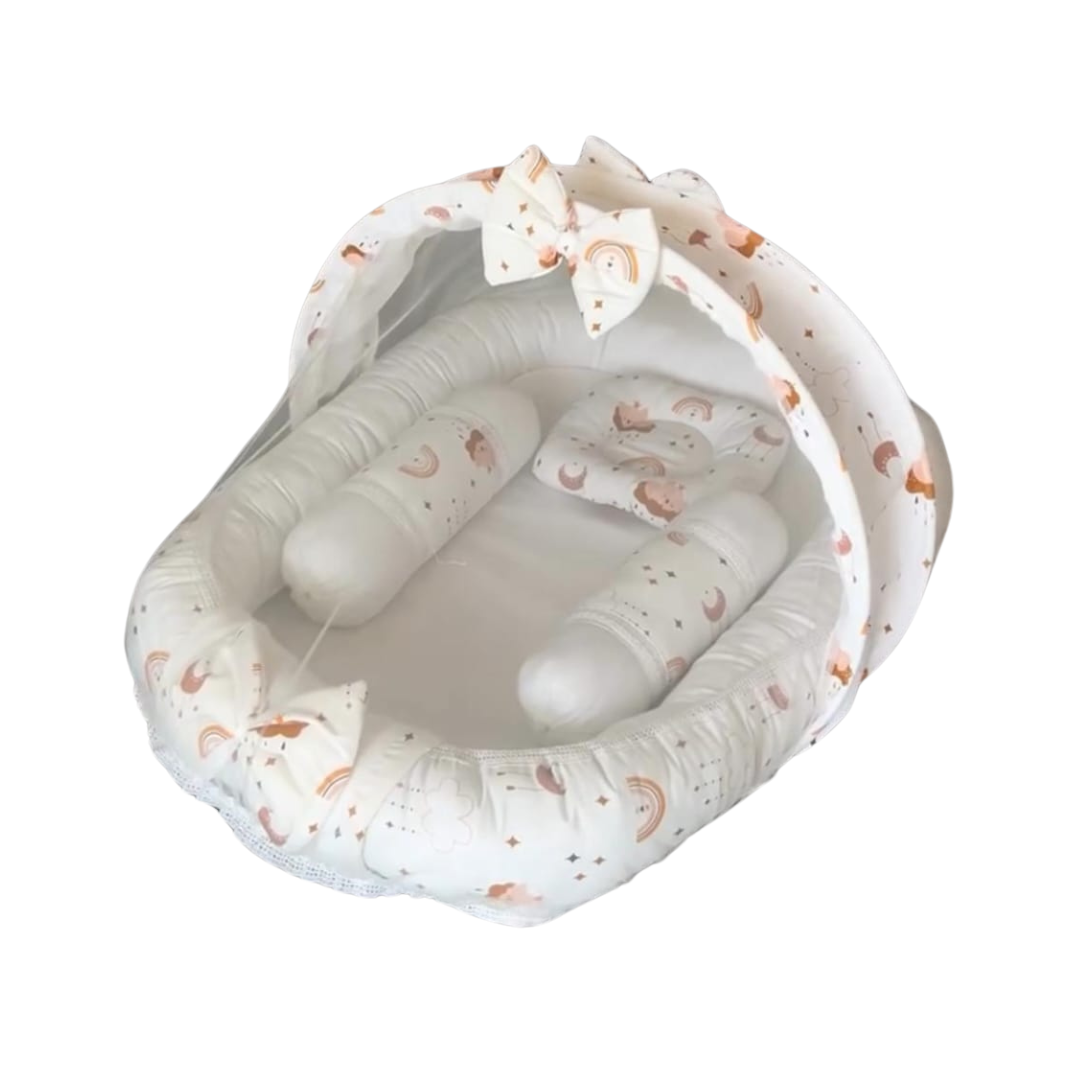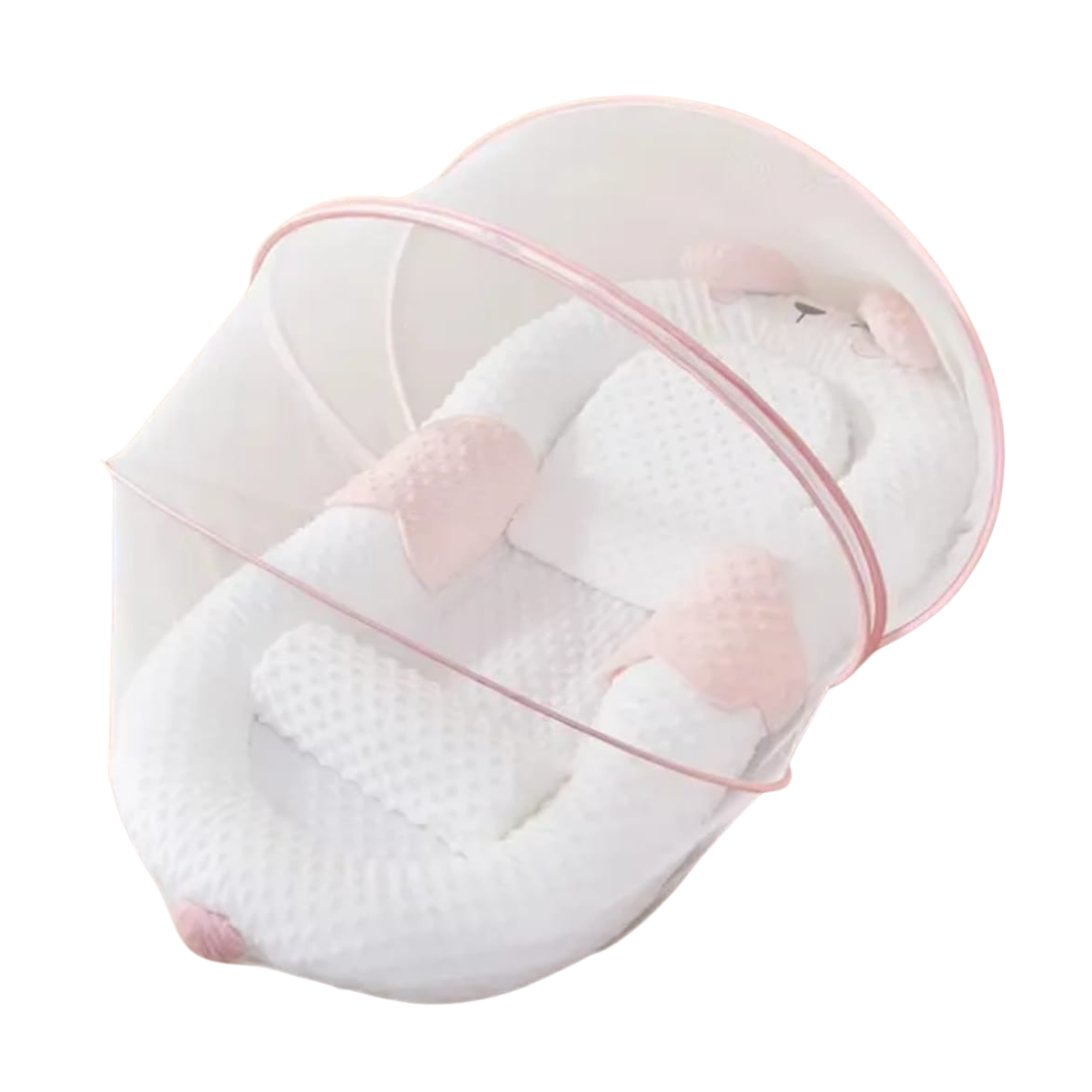 Give your baby the perfect blend of safety and comfort with our ultra-soft baby lounger. Featuring a built-in mosquito net and ergonomic support, it’s ideal for naps, tummy time, and travel – all in one adorable, machine-washable package.