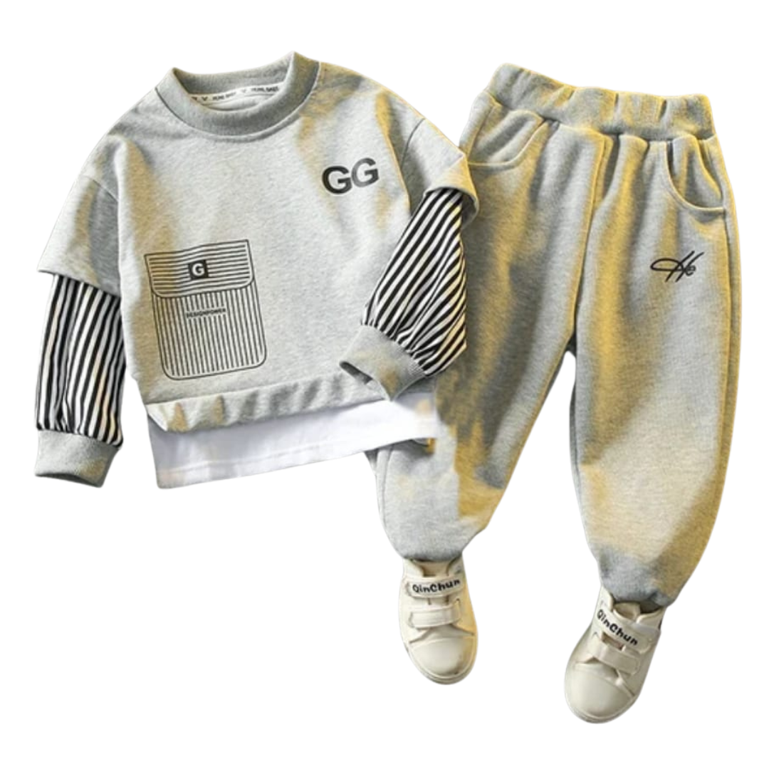 A layered-look sweatshirt and joggers create effortless style and comfort.