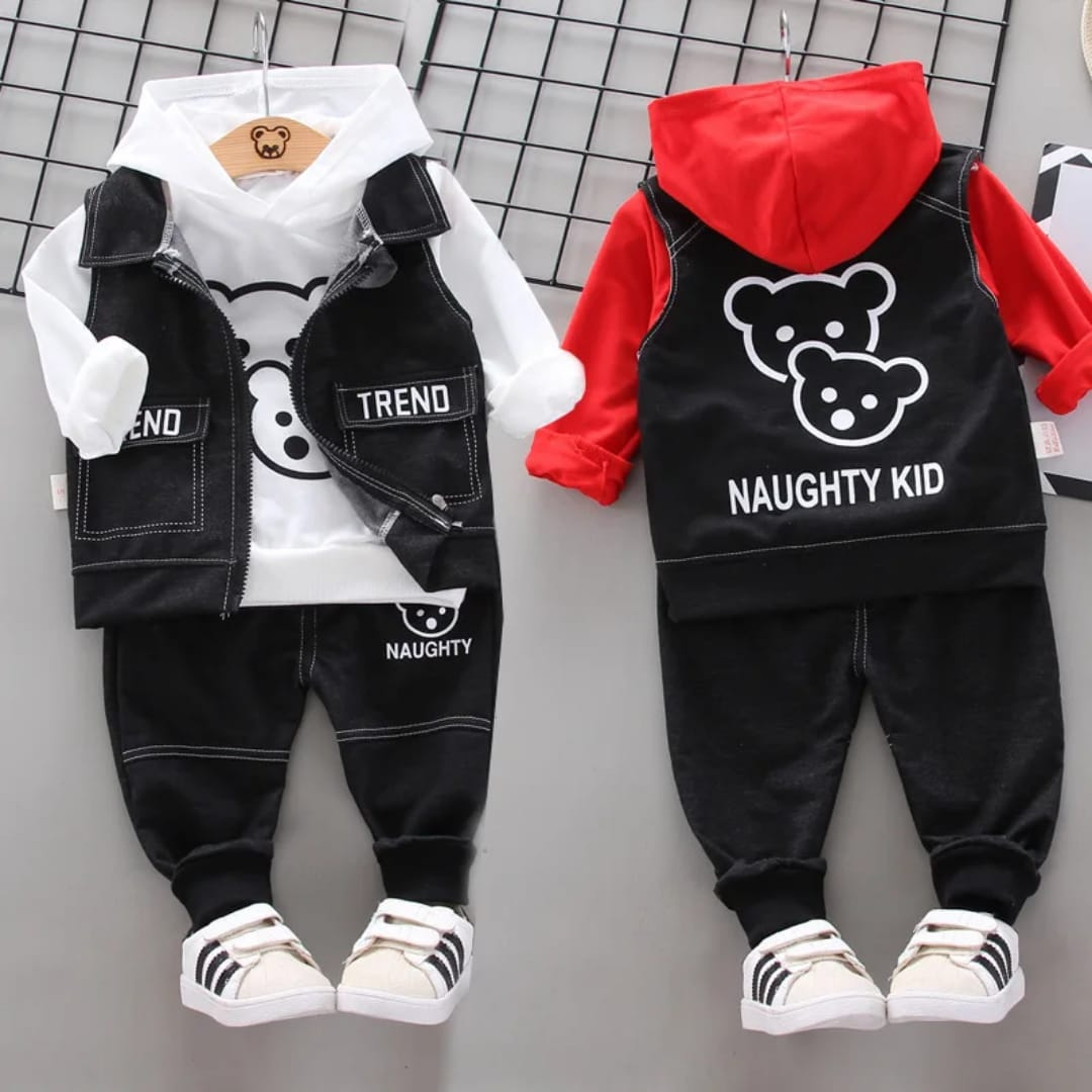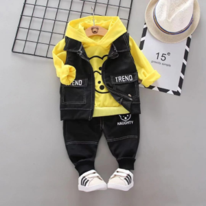 Featuring a hoodie, vest, and joggers—perfect for everyday wear and special outings.