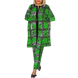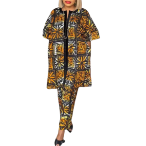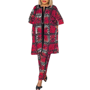 Ethnic charm meets modern chic! The Symmetric Splendor: Long tunic & slim-fit trousers in a bold geometric black, gold & white pattern. Relaxed fit, all-day comfort. A statement piece for the fashion-forward.